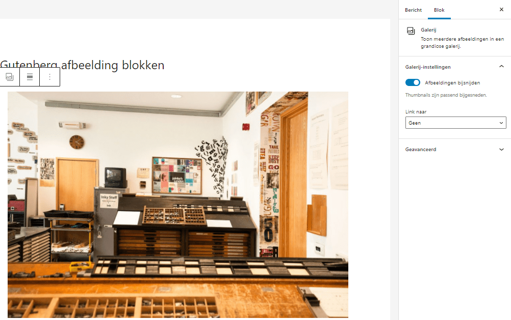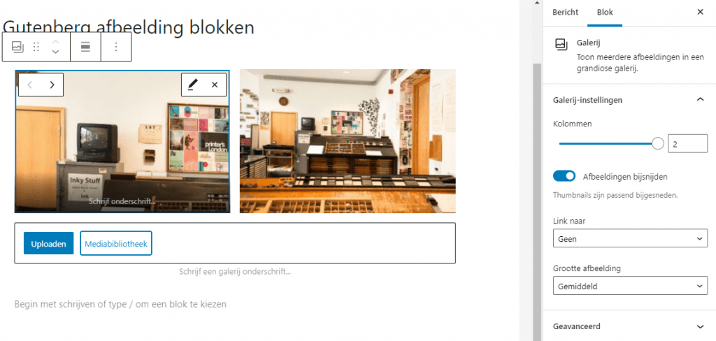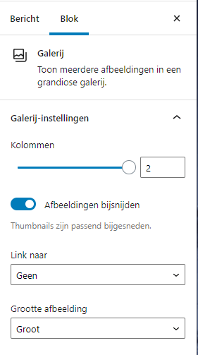 Zodra er meerdere afbeeldingen in de galerij staan verschijnt de optie Kolommen. Hiermee kan het aantal kolommen worden ingesteld. De weergave verandert direct mee bij het wijzigen. De knop Afbeeldingen bijsnijden zorgt ervoor dat ze passend worden gemaakt naar het omliggende element en zorgt ervoor dat afbeeldingen automatisch worden bijgesneden. Linken naar en Grootte afbeelding zijn instellingen die we inmiddels al kennen van het Afbeelding blok zelf. Voor Geavanceerd geldt weer hetzelfde als hiervoor.