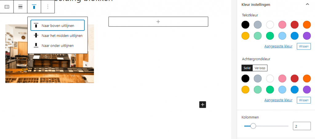 Bij de blok instellingen van het Kolommen blok zijn er diverse mogelijkheden om de Kleur instellingen aan te passen, zoals ook in de screenprint onder te zien is. Ook is het hierbij mogelijk om een verloop te maken in de achtergrond en om aangepaste kleuren met een kleurenkiezer te selecteren. De belangrijkste instelling is het aantal Kolommen. Stel deze in op twee of meer kolommen en je kunt in elke kolom een afbeelding toevoegen. Ook kun je de horizontale en verticale uitlijning instellen in de werkbalk.