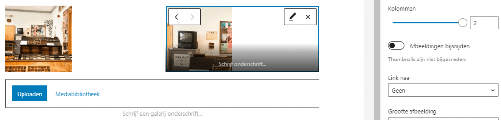 Een galerij heeft altijd meerdere afbeelding, anders is het niet nodig om hem te gebruiken. We voegen nog een tweede afbeelding toe om ook de opties voor meerdere afbeeldingen te laten zien. Let op dat Afbeeldingen bijsnijden aan staat. De afbeeldingen vullen nu netjes de kolommen en zijn automatisch waar nodig bijgesneden. Zet je dit uit, dan kun je grote verschillen krijgen in formaat van de afbeelding, afhankelijk van de originele grootte.