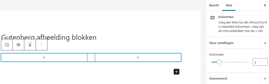 Het Kolommen blok is eigenlijk geen afbeelding, maar een Afbeelding blok kan er wel naar geconverteerd worden. Het wordt normaal gebruikt om tekst netjes in kolommen te plaatsen, maar wordt ook vaak gebruikt om afbeeldingen in bijvoorbeeld een rij of grid (meerdere rijen) uit te lijnen. Het wordt gebruikt als je niet alle opties van een galerij nodig hebt maar wel meerdere afbeeldingen op een nette album-achtige manier wilt presenteren. Vandaar dat we het Kolommen blok hier ook bepreken.