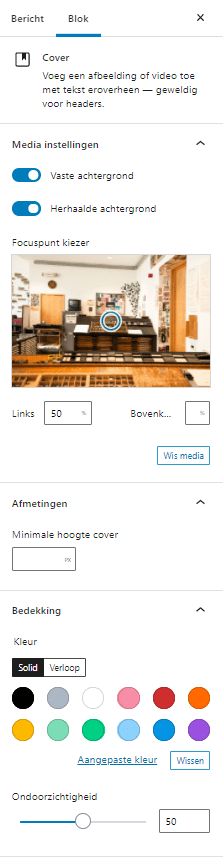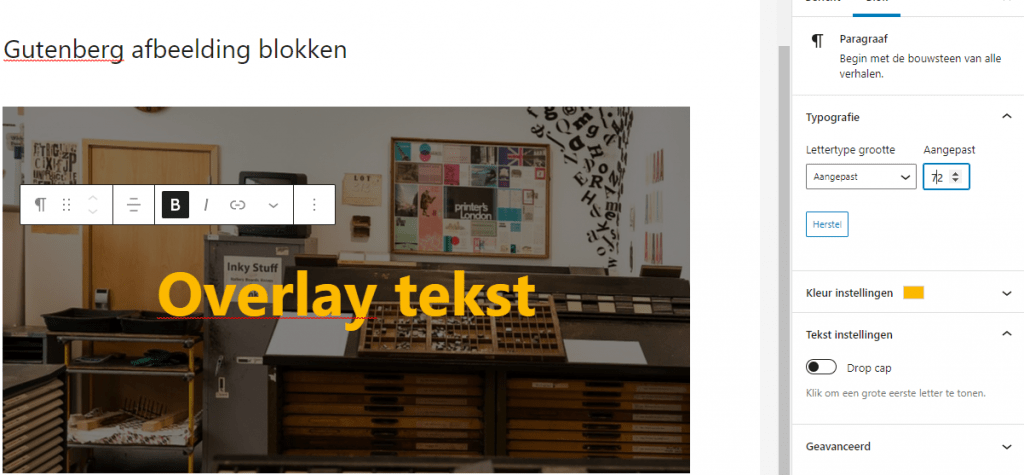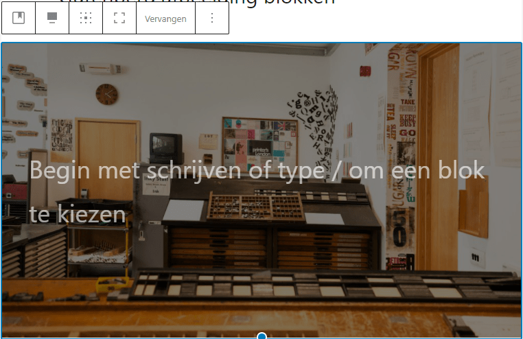 - Tekst over de afbeelding plaatsen; let op, hierdoor wordt de afbeelding geconverteerd naar een Cover blok