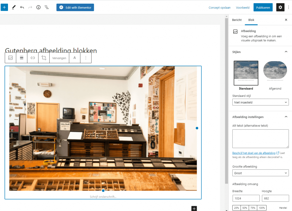 Via de werkbalk boven het Afbeelding blok kun je de volgende wijzigingen aanbrengen.