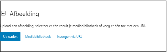 In alle gevallen kun je daarna het blok ‘Afbeelding’ selecteren en invoegen. Daarna kun je met één van de buttons op het blok een afbeelding uploaden, invoegen via de Mediabibliotheek of Invoegen via URL. Daarover zo meer. - Een afbeelding vanaf elders kopiëren en plakken (Ctrl-C->Ctrl-V).