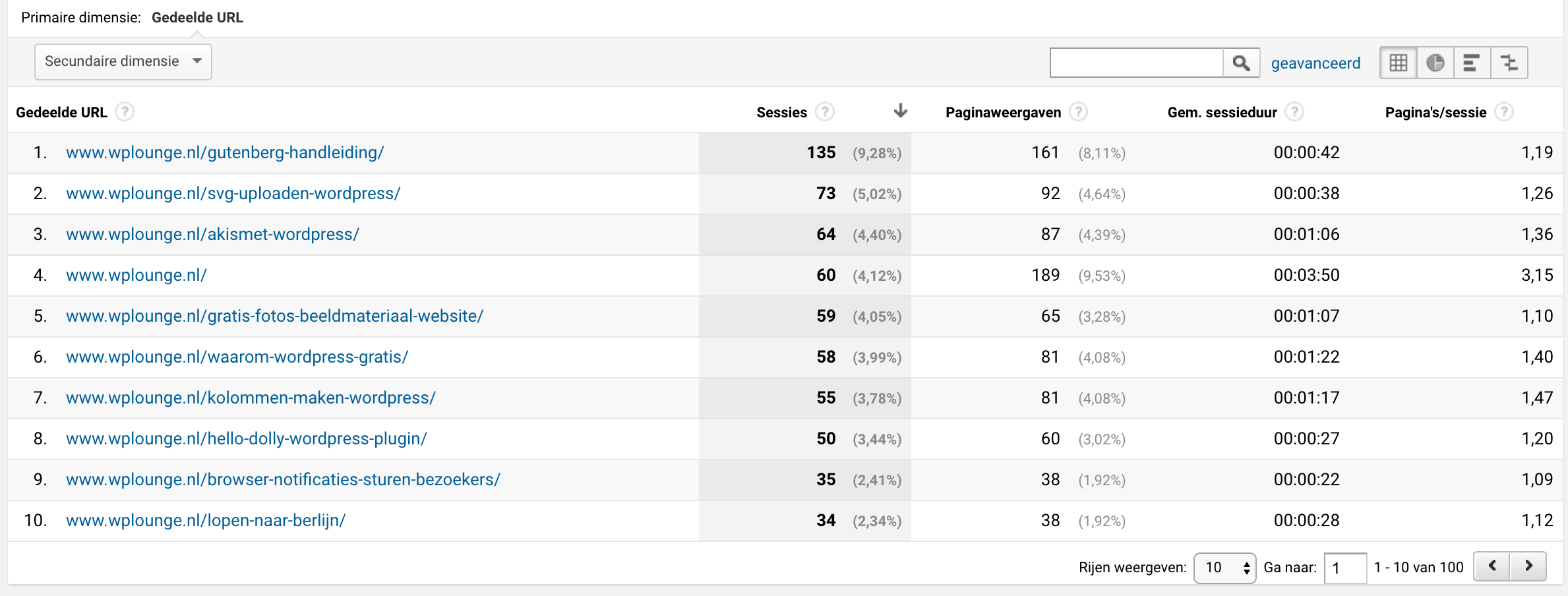 Zo kun je precies zien op welke gedeelde URL’s veel sociaal verkeer binnenkomt. Ook hier zie je dat onze Gutenberg handleiding het de laatste tijd goed doet.