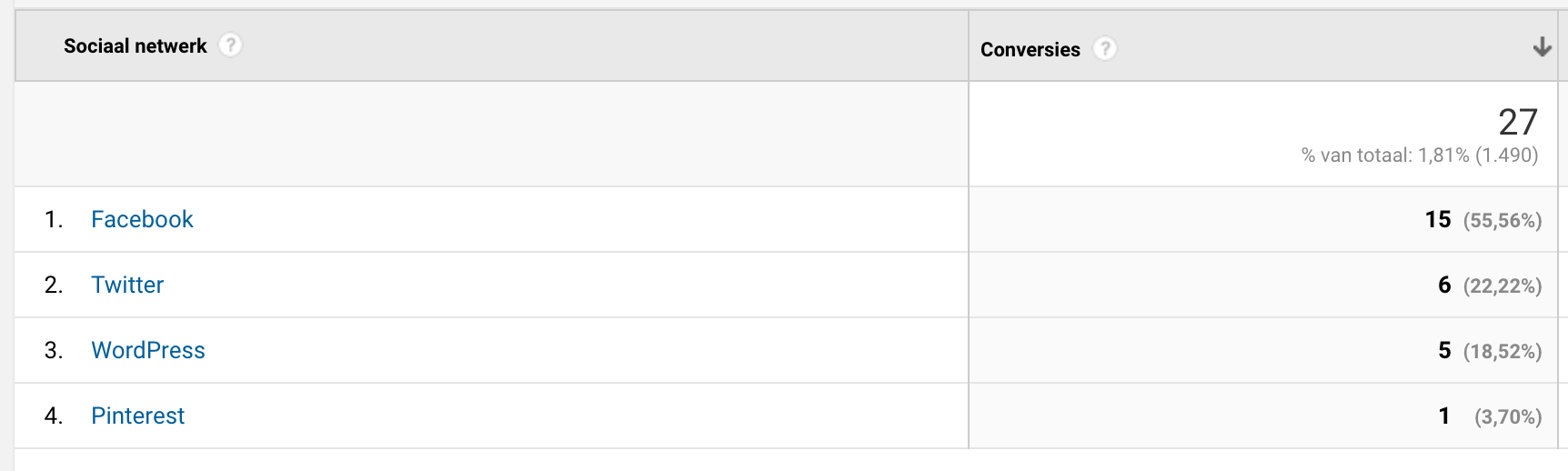 Bedenk je wel dat het hier gaat om het absolute aantal conversies. Als je veel bezoekers uit Facebook haalt, is het vrij logisch dat hier de meeste conversie vandaan komen.