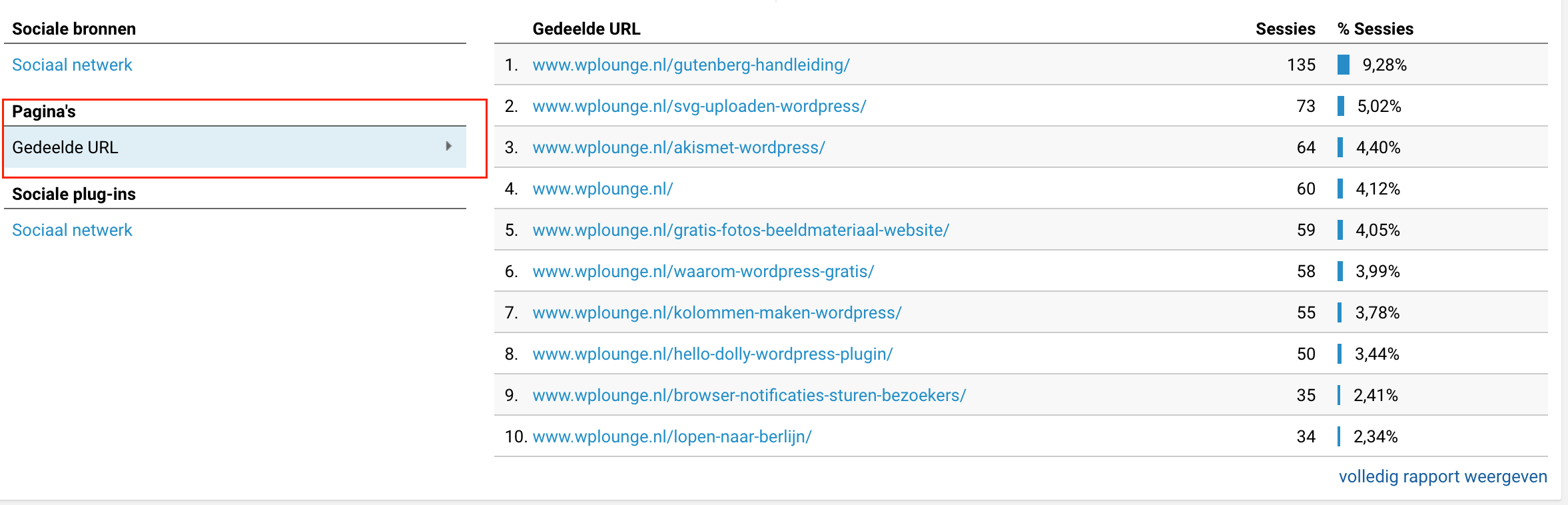 Het is ook interessant om te bepalen welke URL’s er veel gedeeld worden op sociale media. Om dit te kunnen zien, ga je terug naar het rapport Acquisitie > Sociaal > Overzicht. Klik vervolgens onderin op Gedeelde URL’s: