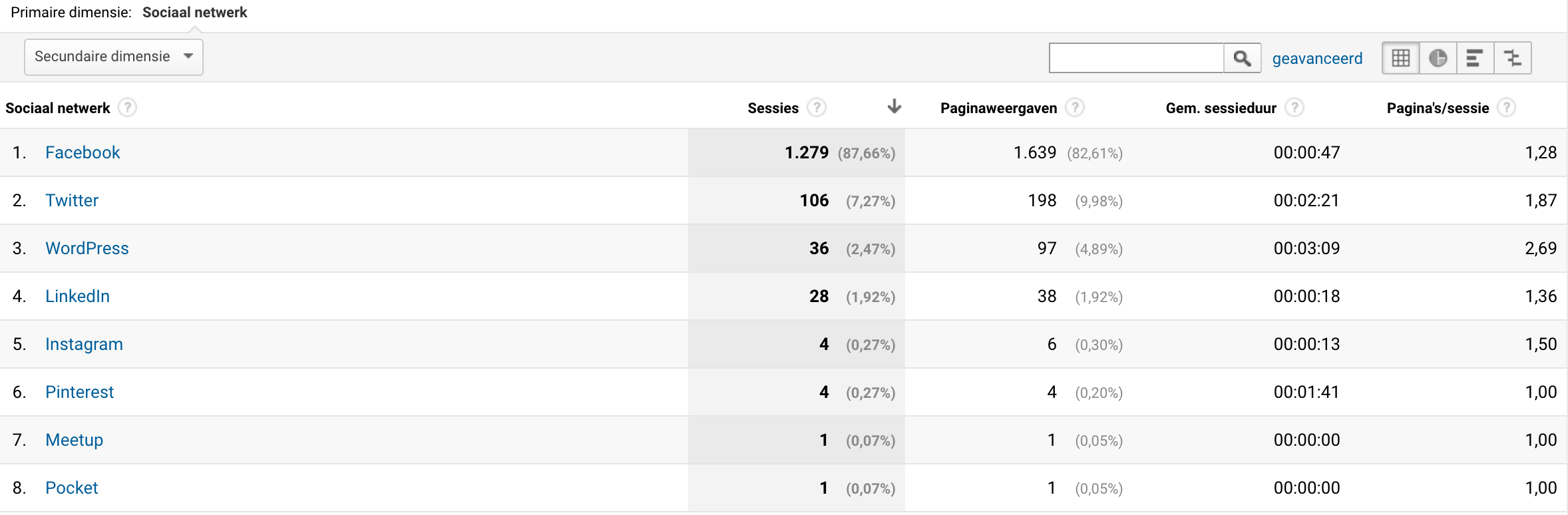 Je kunt hier zien uit welke social media de meeste bezoekers afkomstig zijn, hoeveel pagina’s ze gemiddeld bekijken per sessie én hoe lang hun sessie gemiddeld duurt. Dit is nuttige informatie, omdat je zo weet uit welke sociale media de meest “relevante” bezoekers afkomstig zijn.