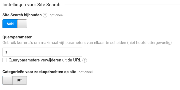 Maak je gebruik van een zoekfunctie op je WordPress-website? Dan wil je natuurlijk weten waar je bezoekers naar zoeken! Ga naar Beheer > Instellingen weergeven (onder “Weergave”). Scroll nu naar Site Search en zet het aan. Vul nu “s” in in het veld: