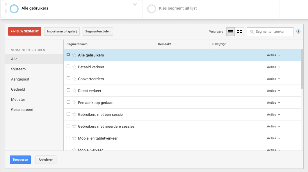 Google Analytics segmentenIn de bovenstaande afbeelding zie je de standaard segmenten in Google Analytics. Je kunt ook zelf een segment aanmaken op basis van allerlei filters. Eén handig standaard filter is “Converteerders”. Je krijgt dan alléén informatie te zien over de bezoekers die tot een conversie geleid hebben. Zo kun je achterhalen hoe deze bezoekers zich gedragen en hier vervolgens weer op inspelen.