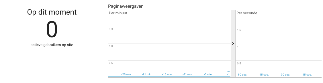 Navigeer nu naar je website en controleer of de “0” in Realtime Analytics in een “1” verandert. Zo ja, dan werkt je trackingcode. Je kunt nu een beetje rondklikken op je website en controleren of Google Analytics alle paginaweergaven goed ziet. Je ziet dit doordat er blauwe strepen zichtbaar worden in het “per seconde”-overzicht aan de rechterkant: