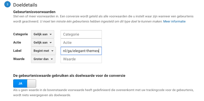 Maak een nieuw doel aan en kies bij Doelconfiguratie voor “Aangepast” (of “Custom”). Onder Doelbeschrijving kies je een naam en het type. Het type is in dit geval een “Gebeurtenis”. Onder Doeldetails kun je nu de gebeurtenisvoorwaarden opgeven die voor een conversie (of “behaald doel”) zorgen. In ons geval is dat wanneer het Label van de gebeurtenis begint met “https://www.wplounge.nl/ga/elegant-themes”.