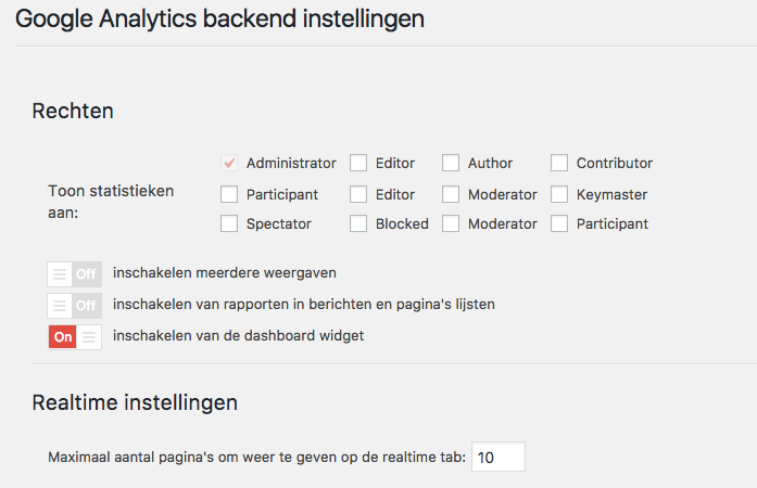 Hier kun je instellen welke gebruikers in WordPress de statistieken kunnen bekijken. Hiervoor moet wel het “Dashboard widget” ingeschakeld zijn.