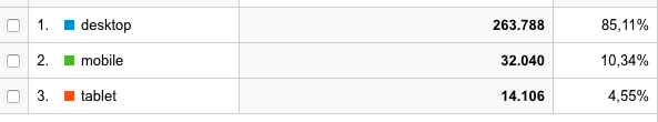 Google Analytics desktop tablet en mobielIs jouw website niet mobielvriendelijk en heb je relatief veel bezoekers van “mobile”? Dan wordt het tijd om een responsive WordPress-theme te gaan gebruiken! Gelukkig zijn vrijwel alle themes tegenwoordig responsive. Een bijkomend voordeel is dat Google mobielvriendelijke websites beloont.