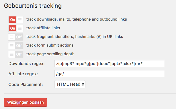 Onder het menu “Trackingcode” vind je allerlei geavanceerde instellingen. Onder “Gebeurtenis tracking” kun je bijvoorbeeld “events” naar Google Analytics versturen. Wij gebruiken dit om kliks naar externe websites en downloads bij te houden:
