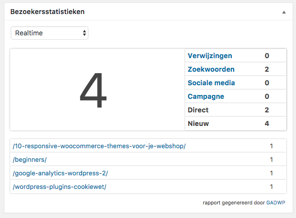 Een leuke feature van Google Analytics is “Real time”. Hier kun je zien hoe veel bezoekers er nu op je website zijn, waar ze vandaan komen en welke pagina’s ze aan het bekijken zijn.