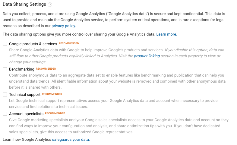 Het is belangrijk dat je de URL van je website goed invult. Zorg ook dat je HTTPS selecteert als je website een SSL-certificaat heeft. Vervolgens ga je instellen in hoeverre de data van jouw Google Analytics-property gedeeld mag worden met derden. Ik zelf vink deze altijd allemaal uit (klik op de afbeelding voor een grotere afbeelding), omdat dit gunstiger is met betrekking tot de cookiewet (daarover later in dit artikel meer).