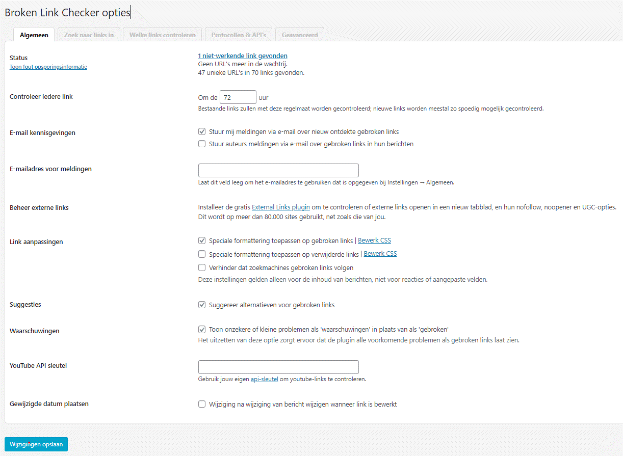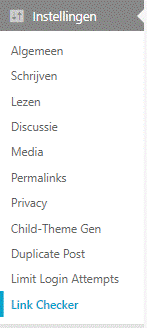 Via het menu onder Instellingen > Link Checker kom je in het scherm terecht van de Broken Link Checker.