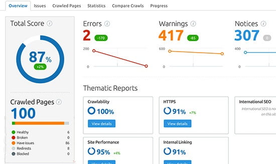 SEMRush is een van de beste SEO-tools op de markt. Je kunt hier mee eenvoudig de SEO-ranglijst en staat van je website bijhouden. Het bevat ook een krachtige site-audittool die je website doorzoekt om fouten te vinden en een gedetailleerd rapport voor je op te stellen.